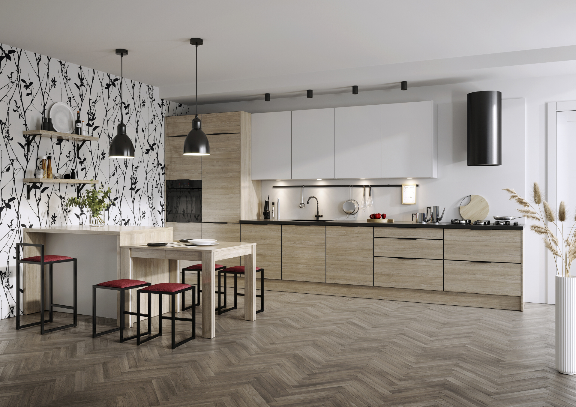 Bryła wyspy jest dominującym elementem wystroju wnętrza, nadając charakter nie tylko kuchni, ale i strefie dziennej, dlatego musi harmonijnie łączyć stylistykę zabudowy meblowej w obu strefach. Duże znaczenie ma odpowiednia kolorystyka i wybrane dekory. Wśród najbardziej popularnych znajdują się wzory drewna i kamieni, ale atrakcyjne są także odwzorowania betonu czy popularne obecnie matowe wybarwienia w monokolorze.